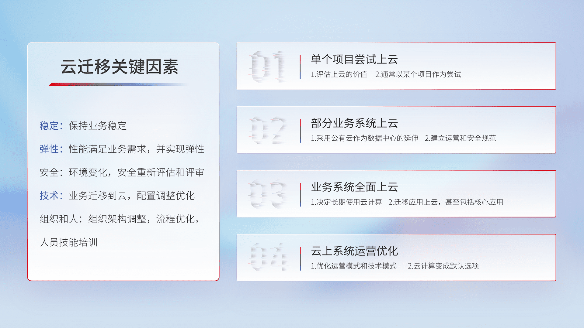 结合实际业务,,,,从规划设计、、、、云平台选型、、、、云原生改造、、、数据迁移、、、集成交付,,,迁移全过程为客户识别最佳上云路径,,,,做好风险识别管理,,设计网络架构、、、、身份权限、、、、安全审计合规、、、、操作审计、、、日志审计、、、、监控告警策略、、、、多站点容灾设计等,,,对云上基础设施进行整体规划,,,提升IT治理水平,,以满足弹性、、、高可用、、、高性能的需求。。