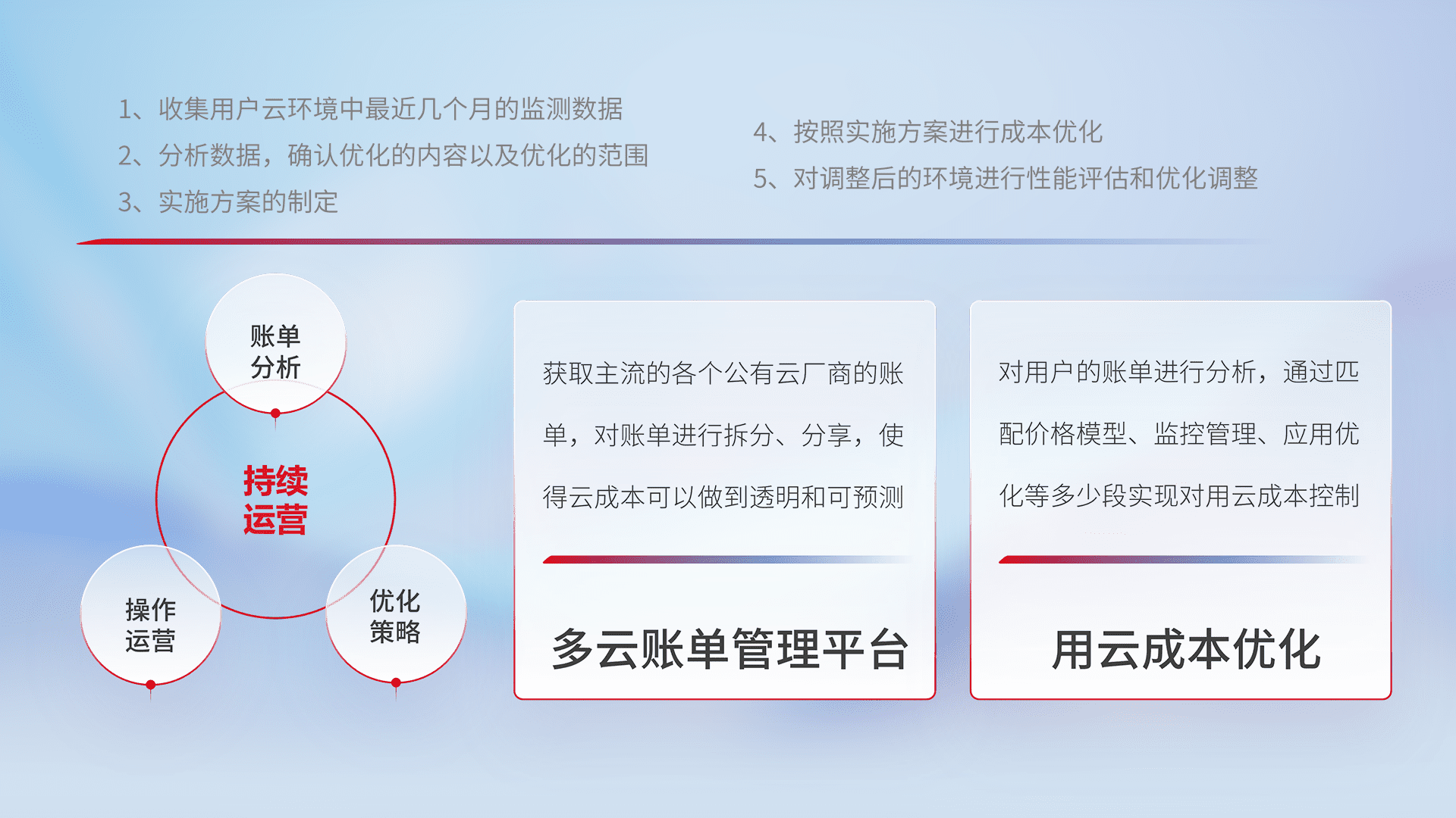 通过多云纳管,,以统一的资源数据模型把客户的云资源进行抽象和封装,,进而实现对多云资源的统一操作,,,保障云资源管理的可靠性、、、稳定性与可用性。。量身定制化运维内容,,配置、、、开发运维、、、、补丁管理、、备份、、监控、、、、认证和访问管理、、、审计和日常巡检等,,保障在用云过程中的可靠度,,稳定度以及高可用率。。