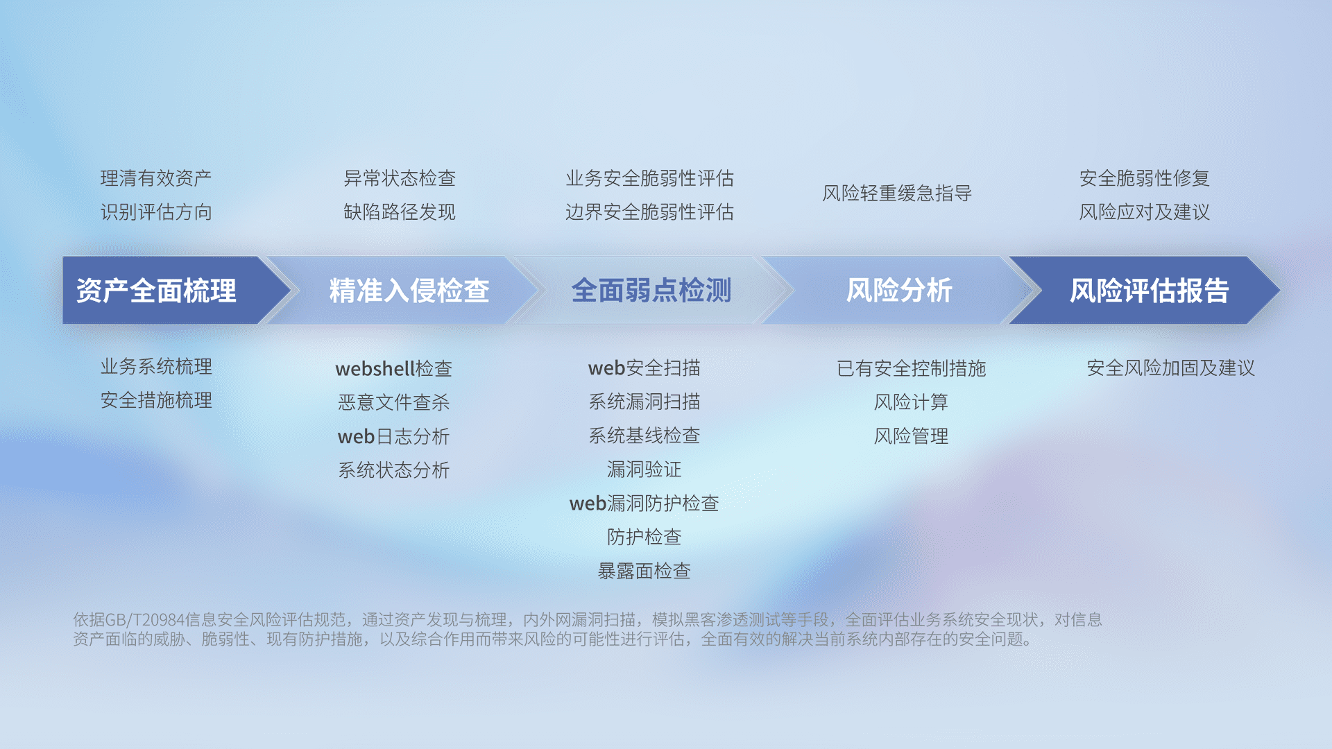 针对客户行业特性,,,以专业的安全服务+多厂商联合解决方案提供专属的一站式安全管理服务,,,,帮助客户全面感知网络空间威胁,,,基于识别、、、、检测、、分析、、、、防护、、监测、、、响应的服务理论模型,,,从方案咨询、、、、集成交付、、评估验证、、、、优化加固、、、、运维运营,,,致力于为客户提供完整的闭环管理式安全服务。。。。以实战经验为客户打造高抵御风险的安全体系,,,,帮助客户发现威胁、、对抗威胁、、处置威胁,,,,不断积累安全对抗能力,,,持续保障数字化安全。。。。